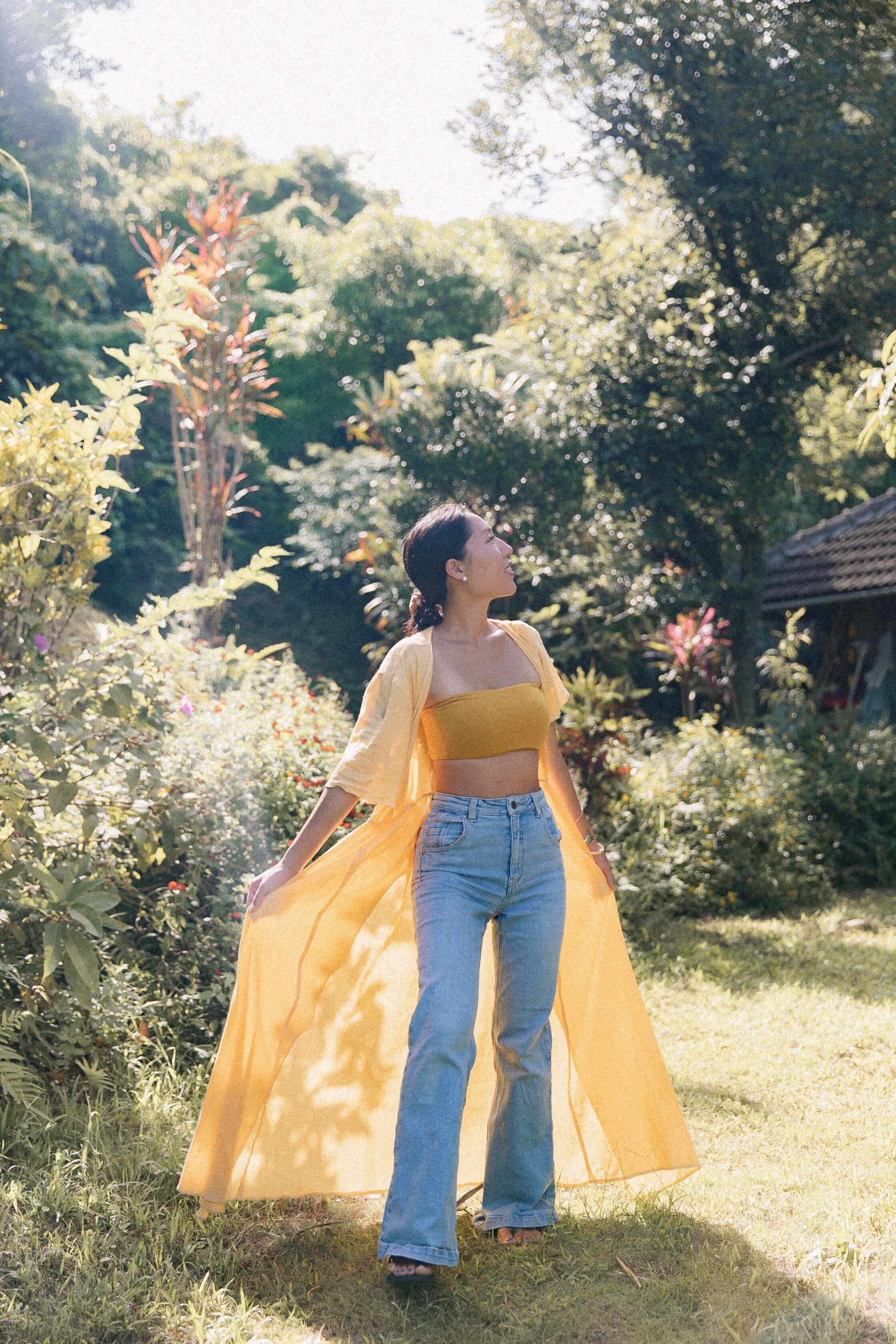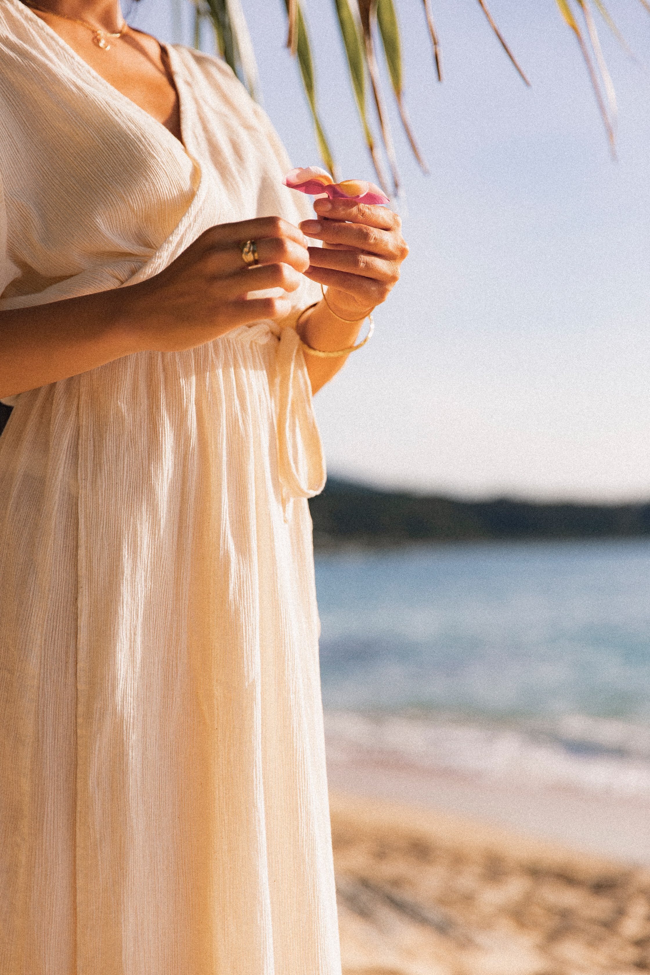 年齢問わず着て頂けるベーシックかつ品のあるラップドレス。紐で大きさを調整出来るようになっており妊婦さんはもちろん、生まれたての赤ちゃんとお母さんをも一緒に包んでくれ、結び方を変えると羽織りにもなります。袖は女性が気にな る二の腕をすっぽり隠してくれるフレアスタイル & ボタンフックで捲り上げるとヘルシ ーな肌見せで女性らしさも出してくれます。